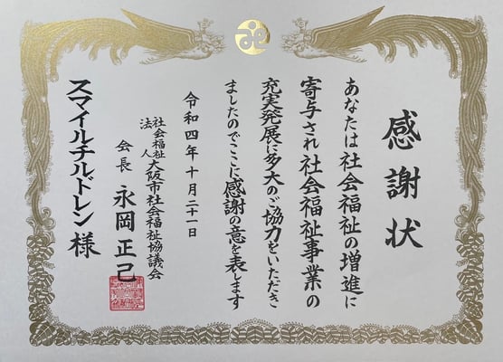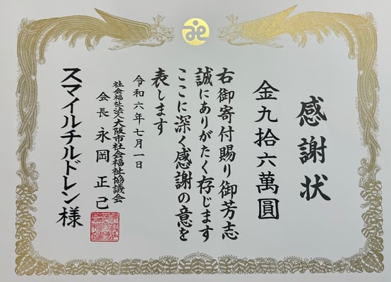 令和6年7月の佳日、大阪市社会福祉協議会にて感謝状授与式が執り行われスマイルチルドレンを応援して下さる全