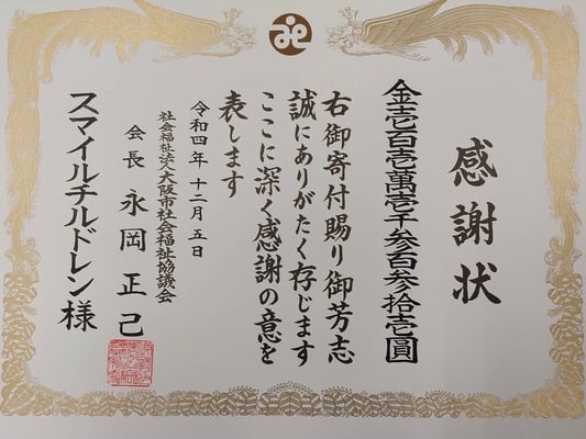 大阪市社会福祉協議会にて感謝状授与式が執り行われスマイルチルドレンを応援して下さる全