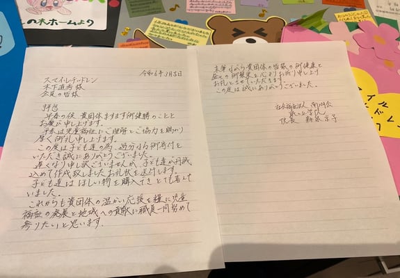 寄付をさせて頂きました(2023年11月当方HPにて掲載)児童養護施設泉ヶ丘学院の児童の皆様からお礼のお便りが届きました。